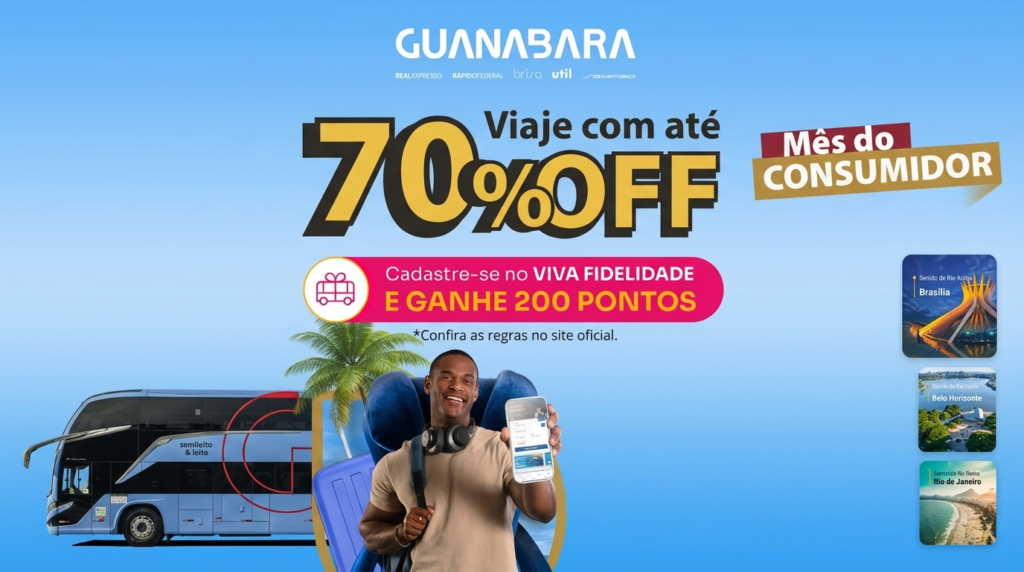Com até 70% de desconto nas passagens, 200 pontos no Viva Fidelidade e taxa zero em rotas selecionadas no aplicativo, a Guanabara se torna uma das melhores oportunidades do ano para quem busca passagens de ônibus promocionais.