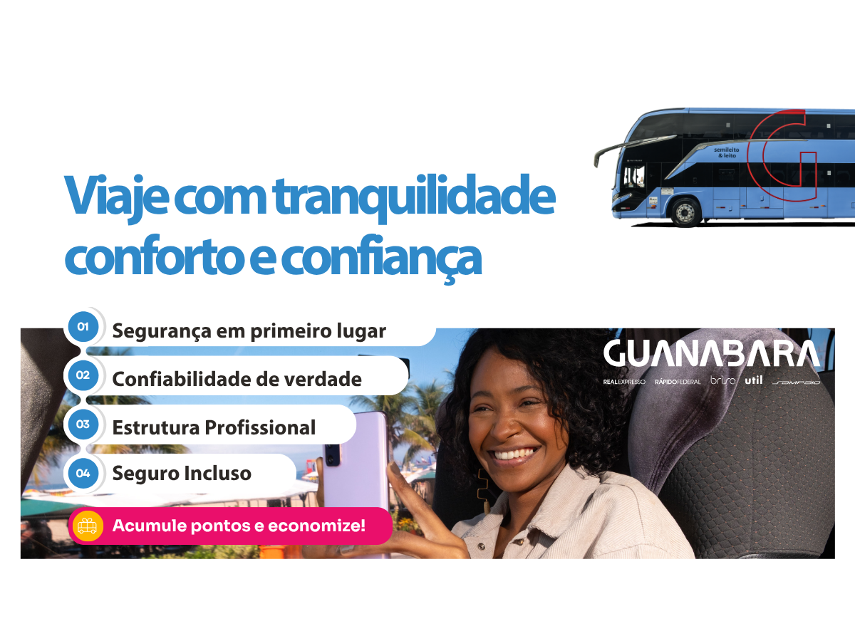 Viajar com a Guanabara também é acumular benefícios. A cada R$ 1 gasto em passagens, você ganha 2,5 pontos no programa Viva Fidelidade, que podem ser trocados por novas viagens e vantagens exclusivas. Assim, cada deslocamento com a Guanabara se transforma em uma oportunidade de ganhar ainda mais.